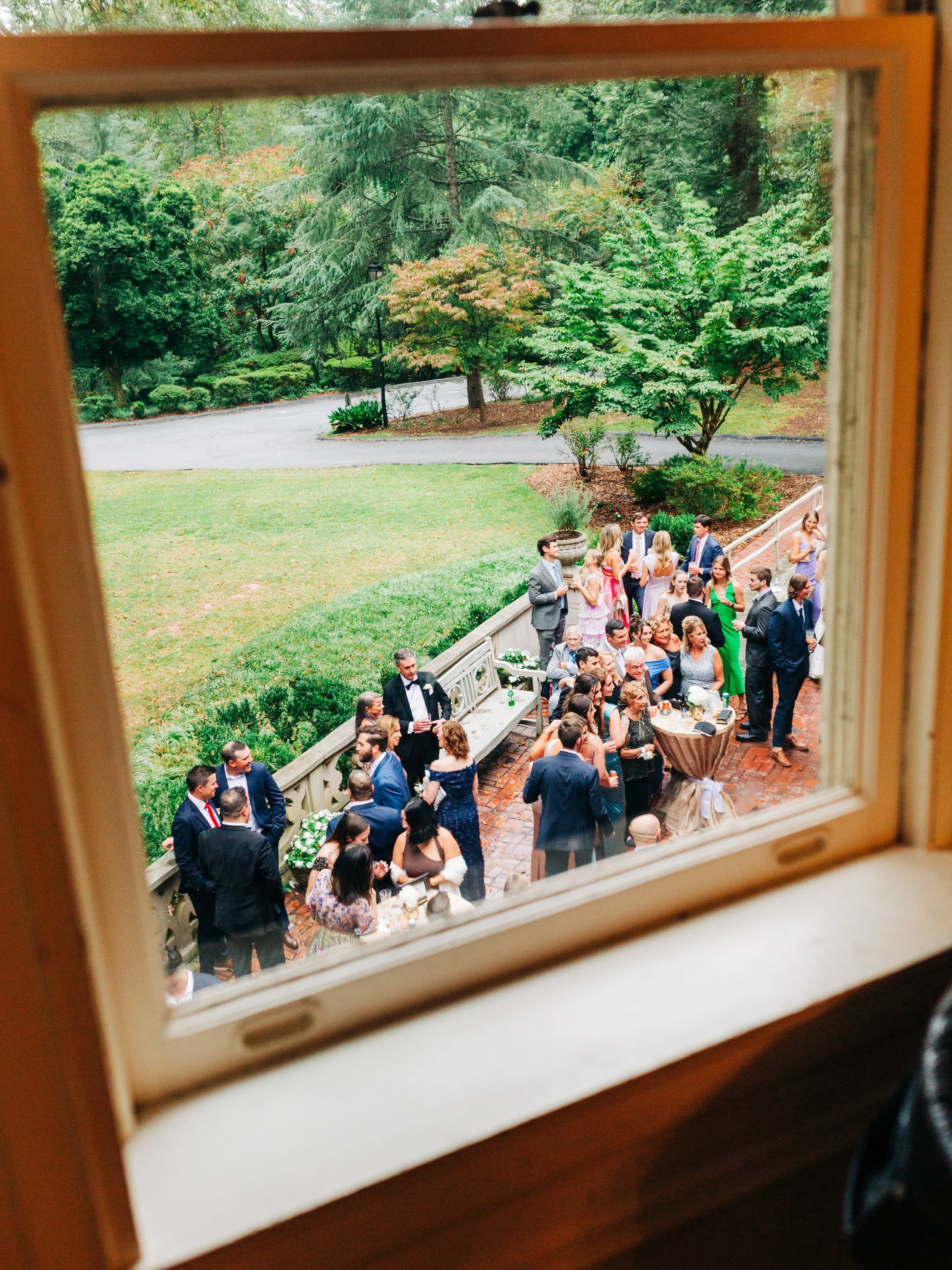 Then, as if on cue, the sky cleared—just in time for cocktail hour. Guests stepped onto the patio, soaking in the fresh air and scenic grounds while enjoying drinks, laughter, and conversation. Jessica and Mike slipped away for a few more outdoor portraits, capturing the light and garden feel they had always imagined for their big day.