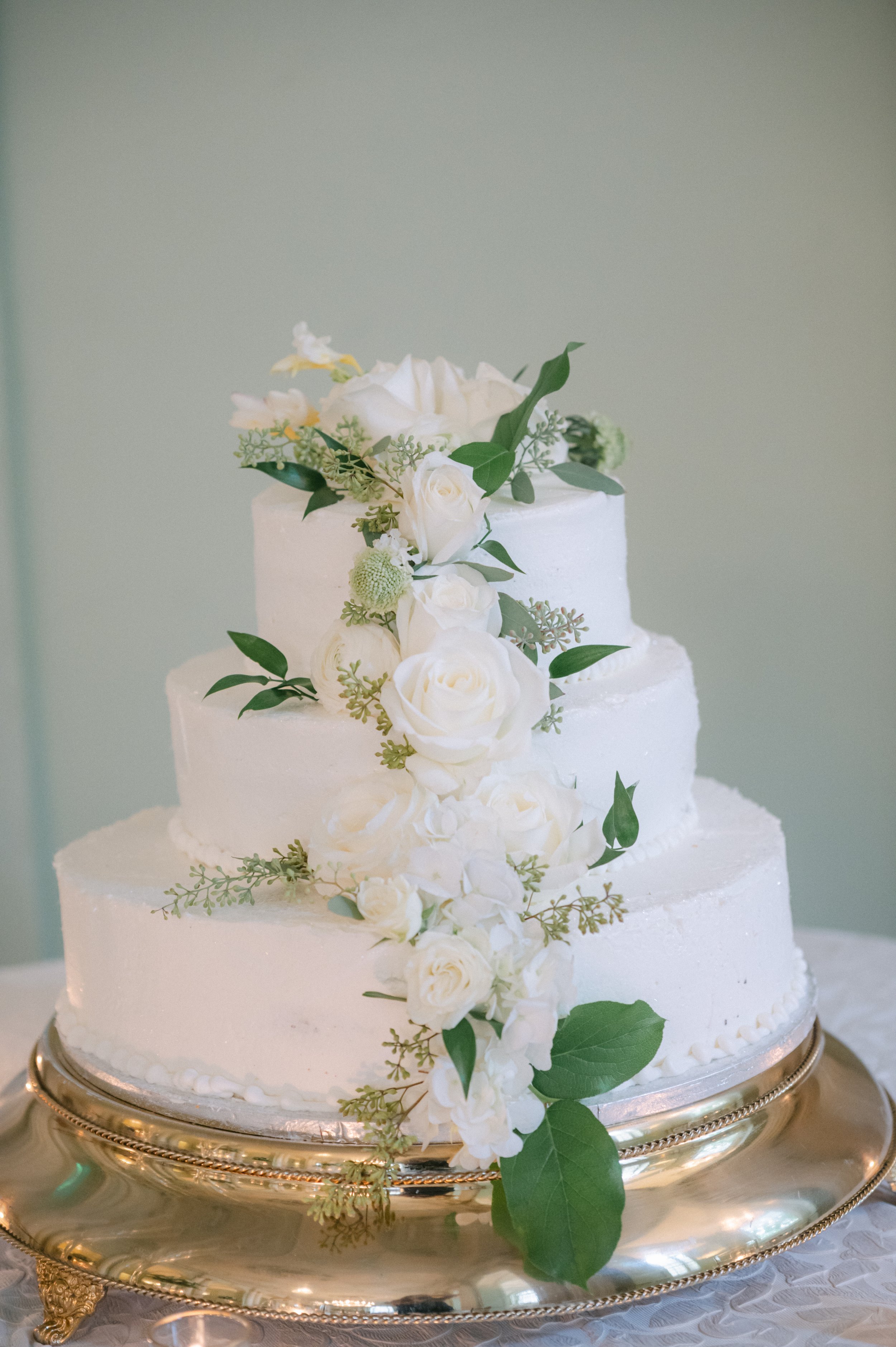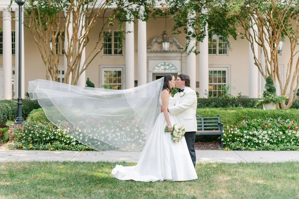 When the ballroom doors opened, guests entered a space glowing with candlelight and adorned with green-and-white floral centerpieces by Blosm. A preset salad awaited them as Kellyann and Chandler shared their first dance as husband and wife. After dinner, the dance floor filled quickly as Emerald Empire Band kicked off an energetic set. The couple later cut their elegant white Publix wedding cake before the evening drew to a close.