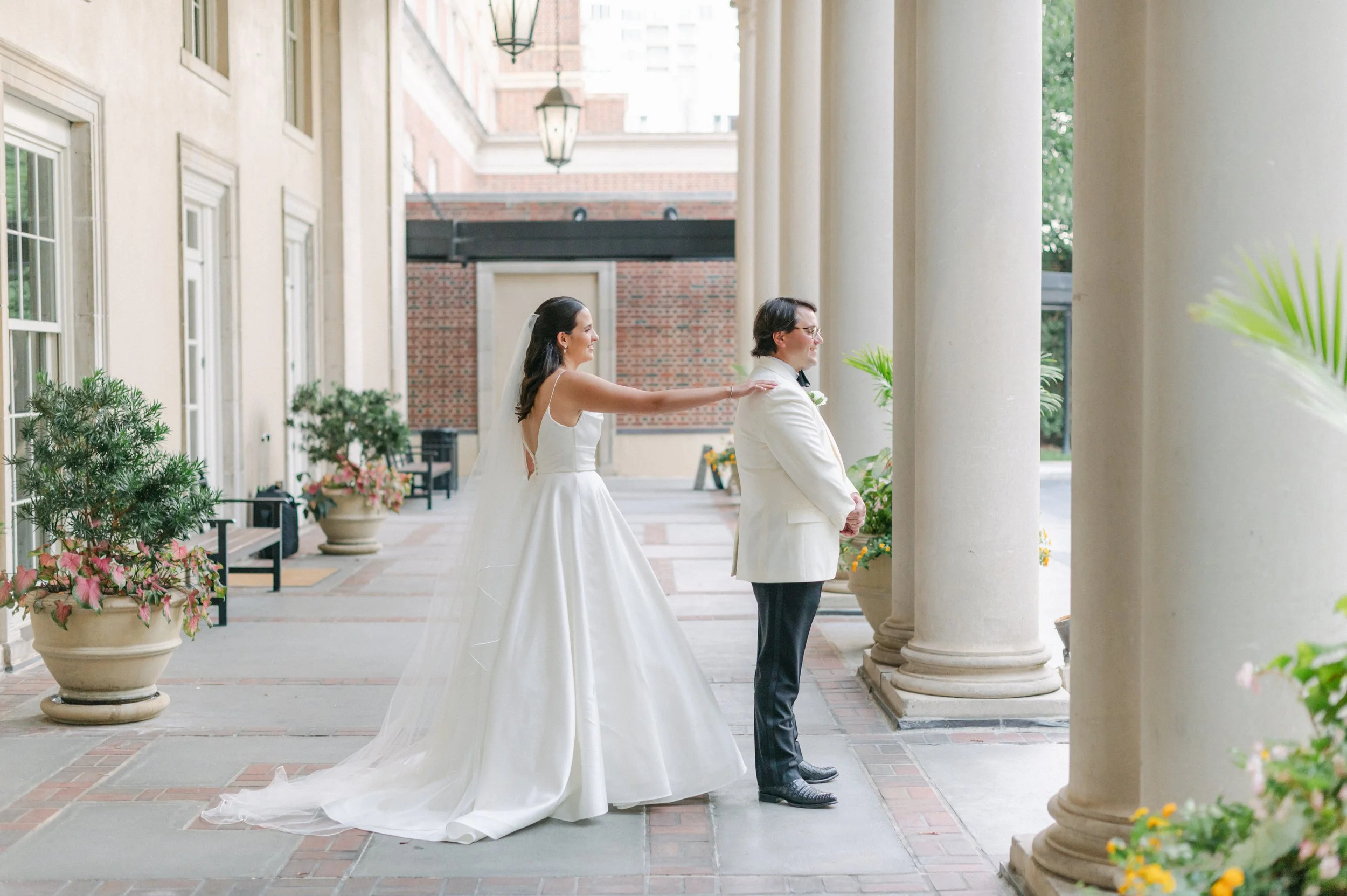 On the morning of the wedding, Kellyann and her bridesmaids enjoyed hair and makeup by The Moore Agency in the bridal suite at the Loews Hotel, while Chandler and his groomsmen got ready at a nearby Airbnb. As the ceremony approached, the couple traveled separately to The Biltmore Ballrooms—one of Atlanta’s most iconic and elegant venues—for a private first look captured by Anne Catherine Photography. Their wedding party and families soon joined them for portraits around the historic property.